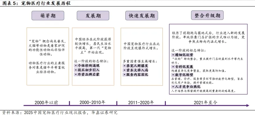 爆炸式增长(2011-2020年): 这一阶段宠物医疗行业呈现爆发态势 。核心驱动力是 养宠人群的爆发式增长、资本的大举入局以及服务内容的持续深化共同催生了高增长 。企业通过快速扩张门店数量来抢占市场,竞争逻辑主要基于规模。