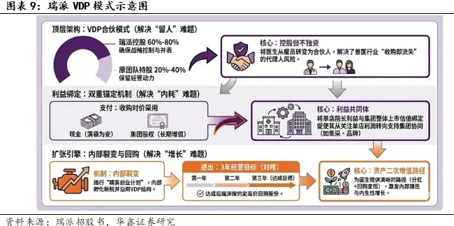 在瑞派的扩张版图中,其核心挑战在于如何解决宠物医疗行业高度依赖兽医个人能力的特性与资本追求标准化复制之间的矛盾。根据档案显示,瑞派并未采用传统的全资买断模式,而是首创了 VDP(Veterinary Development Partners,兽医发展合伙人)模式。这一模式的根本逻辑在于承认医生的人力资本价值,通过股权结构的精妙设计来解决代理人风险。