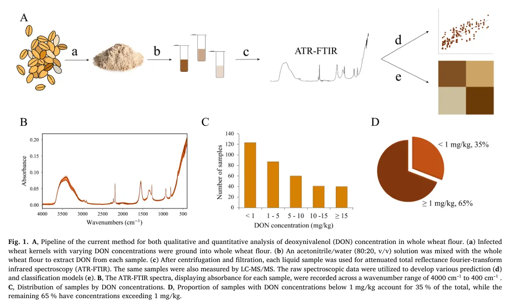 该研究首次利用红外光谱对DON提取物进行检测并构建定量与分类预测模型。该方法操作简便、检测快速、成本低廉,具备开展大规模DON污染筛查与风险评估的应用潜力。