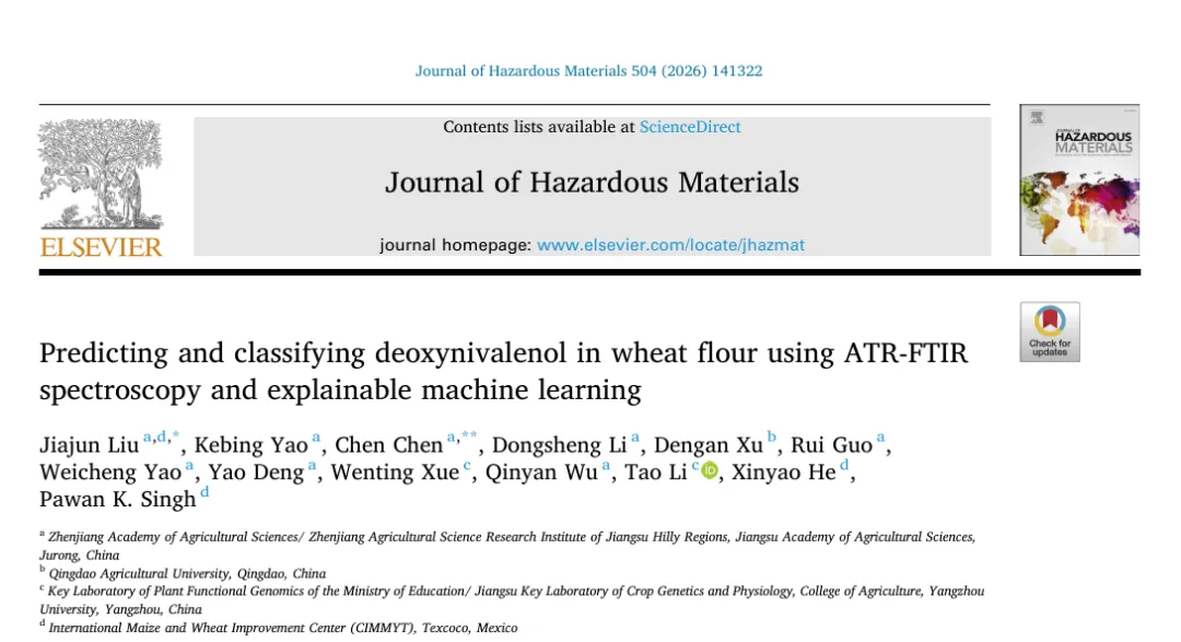 近日,江苏丘陵地区镇江农业科学研究所联合扬州大学、青岛农业大学和国际玉米小麦改良中心CIMMYT,在一区Top期刊《Journal of Hazardous Materials》(IF=11.3)发表题为“Predicting and classifying deoxynivalenol in wheat flour using ATR-FTIR spectroscopy and explainable machine learning”的研究论文。助理研究员刘家俊为论文第一作者,姚克兵研究员、李东升副研究员、徐登安副教授、李韬教授和何心尧教授为此研究做出了重要贡献。该研究得到生物育种钟山实验室等项目的资助。