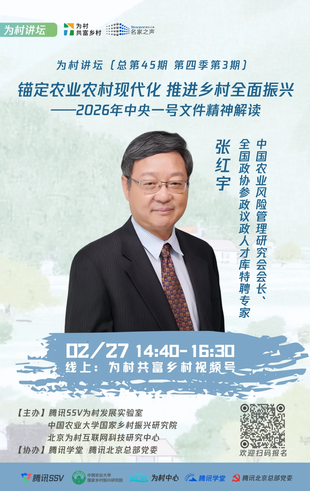 本期邀请中国农业风险管理研究会会长、全国政协参政议政人才库特聘专家张红宇分享《锚定农业农村现代化 推进乡村全面振兴——2026年中央一号文件精神解读》。