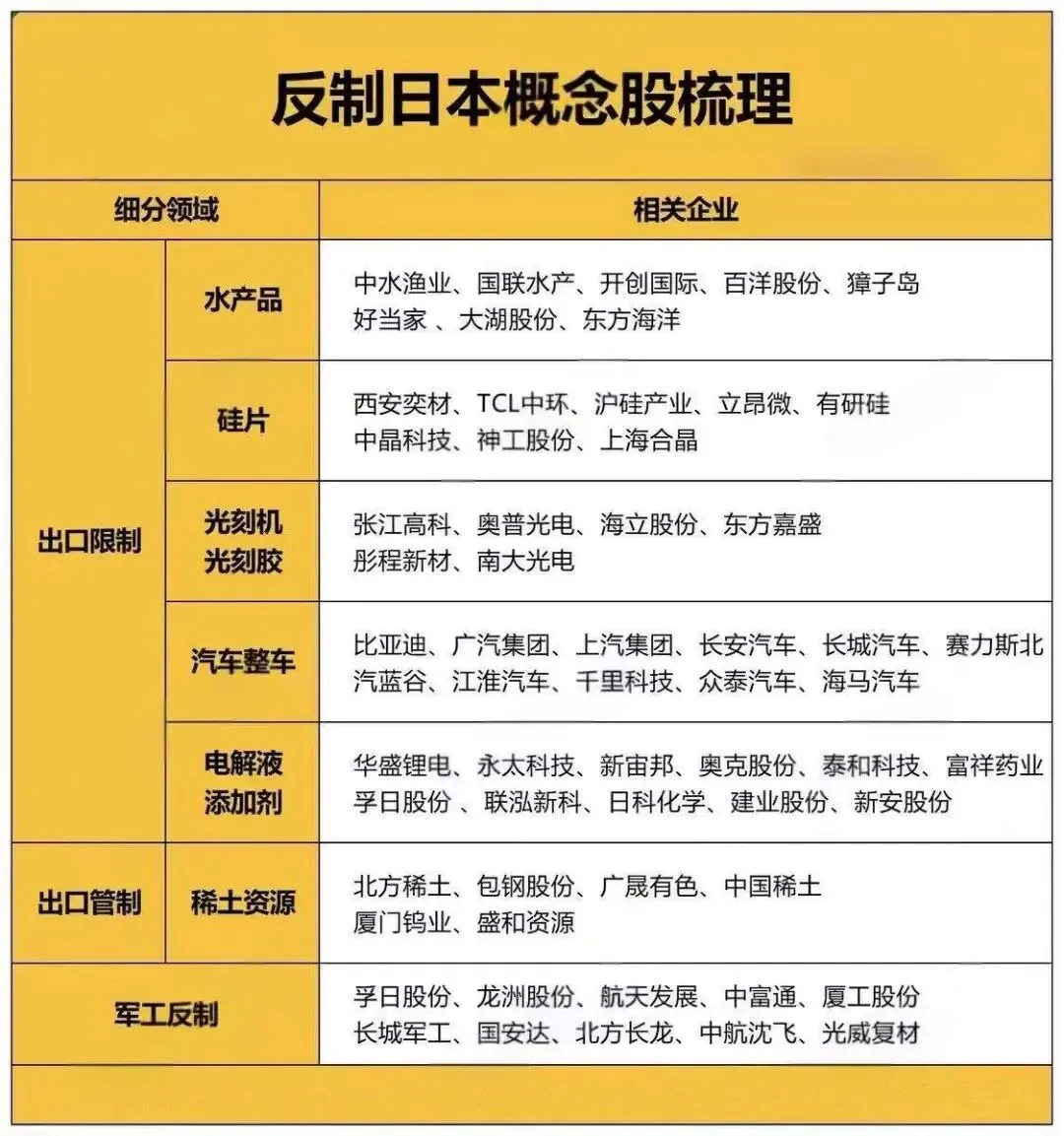 反制日本概念股的底层逻辑源于“供需结构重构”:一方面,若限制日本相关产品进口(如水产品、高端材料),国内同类企业将获得市场份额扩容机会;另一方面,若日本强化技术或设备出口管制,国内长期依赖进口的领域将加速国产替代进程。这两条主线分别对应“进口替代型”和“自主突围型”两类标的,前者侧重短期市场份额提升,后者侧重长期技术价值兑现。