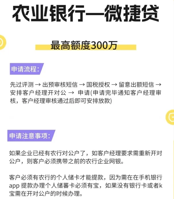 ①微捷贷(必须走对公户):面向小微企业,以企业纳税数据(A/B/M级)为核心授信依据,法定代表人申请。