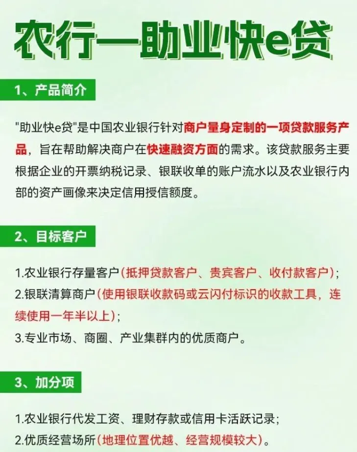 ②助业快e贷(个人卡即可):面向个体工商户、小微企业主个人,以收款码流水、房贷、农行贵宾资质为核心授信依据。