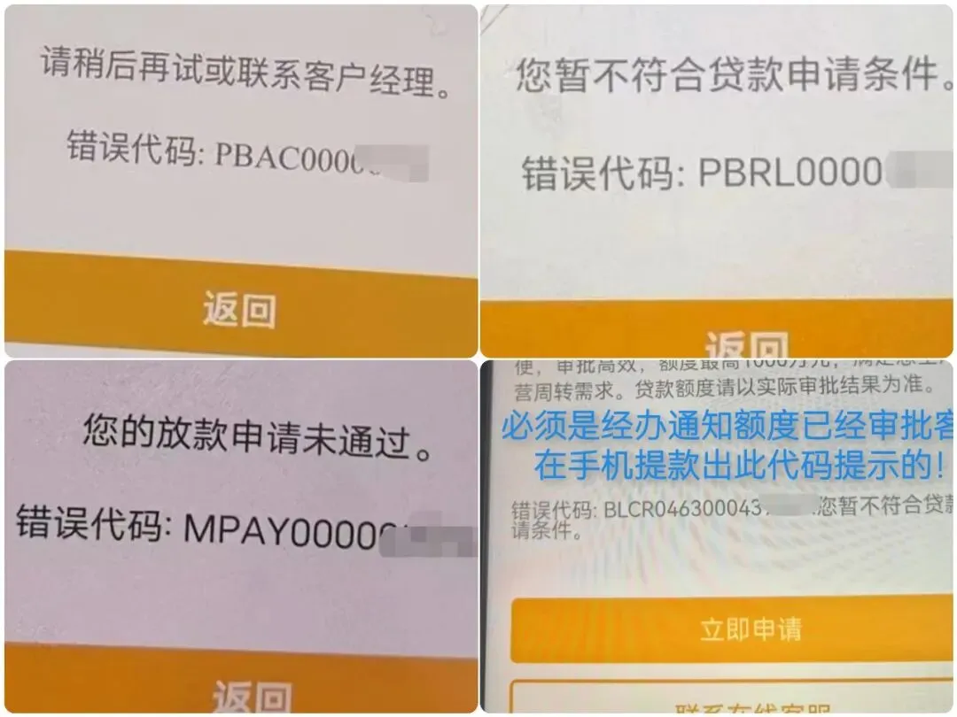 8、特别注意⚠️:部分在农行已取得授信额度却在支用时候喜欢跳错误代码比如:PBRL000开头;PBAC000开头;MPAY000开头;BLCR0463开头的都不用放弃,因为这些错误提示中大部分都是可以回捞的,放弃了很可惜!