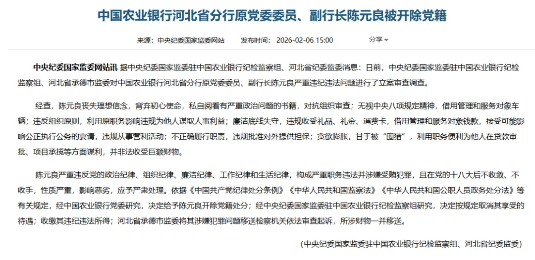2月6日,中央纪委国家监委驻农行纪检监察组、河北省纪委监委刚发布通报:中国农业银行河北省分行原党委委员、副行长陈元良,因严重违纪违法被开除党籍!他涉嫌受贿犯罪的问题,也已经移送检察机关依法审查起诉了。