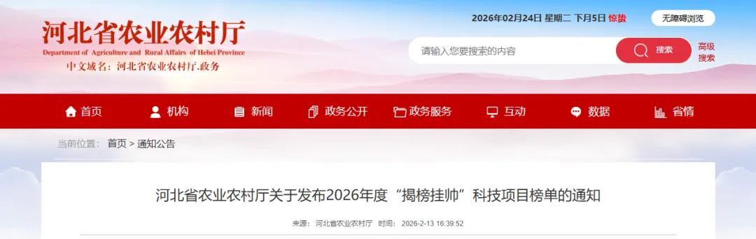 河北省农业农村厅在前期公开征集重大科技需求基础上,聚焦企业创新和重点产业发展需要,遴选了一批“揭榜挂帅”科技项目需求,择优形成了2026年度科技项目榜单(详见附件)。