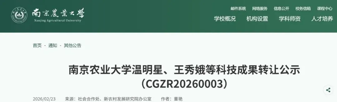 近日,南京农业大学根据《中华人民共和国促进科技成果转化法》相关规定,对农学院拟转让的一项重要科技成果进行公示,公示时间2026年2月22日至2026年3月8日。见证农业科技创新与产业发展的深度融合,为乡村振兴注入强劲科技动能!
