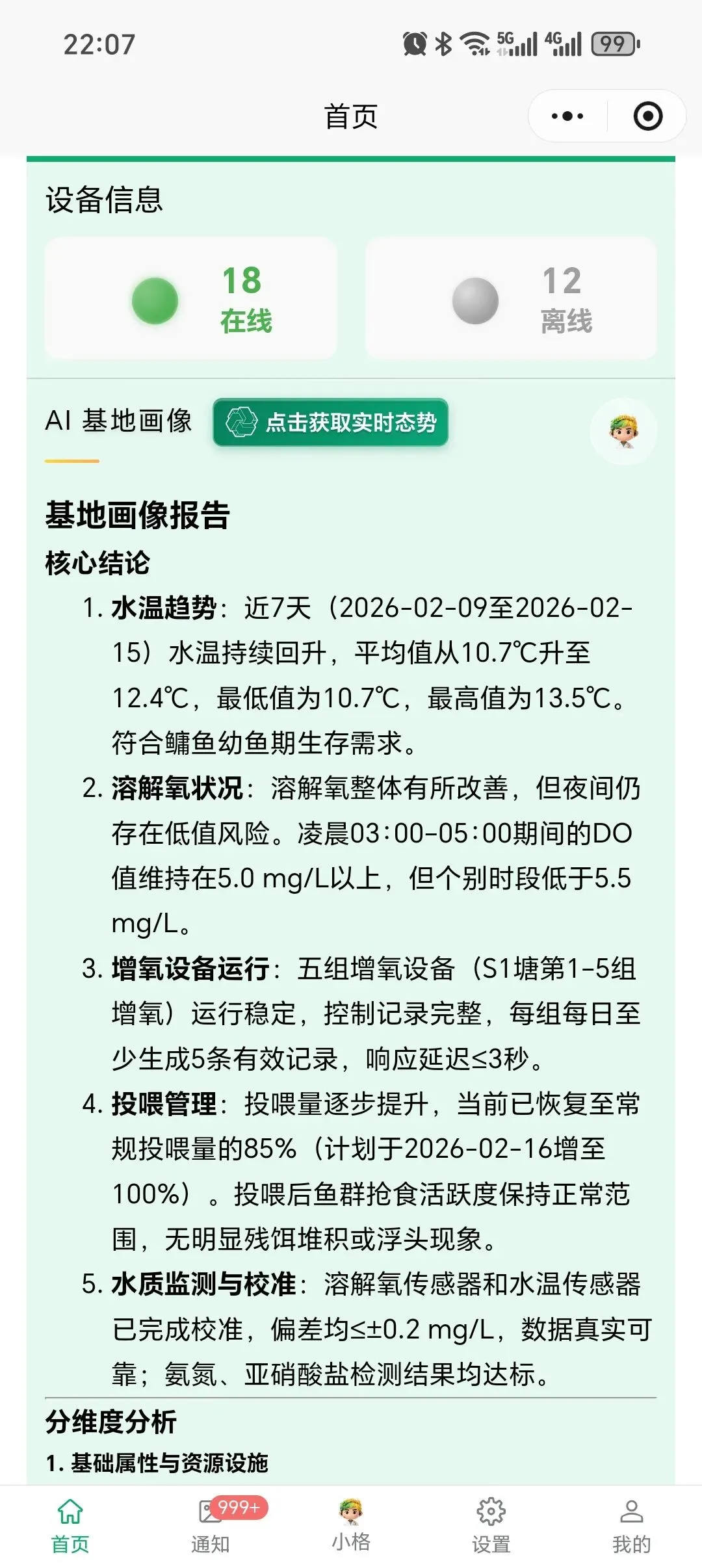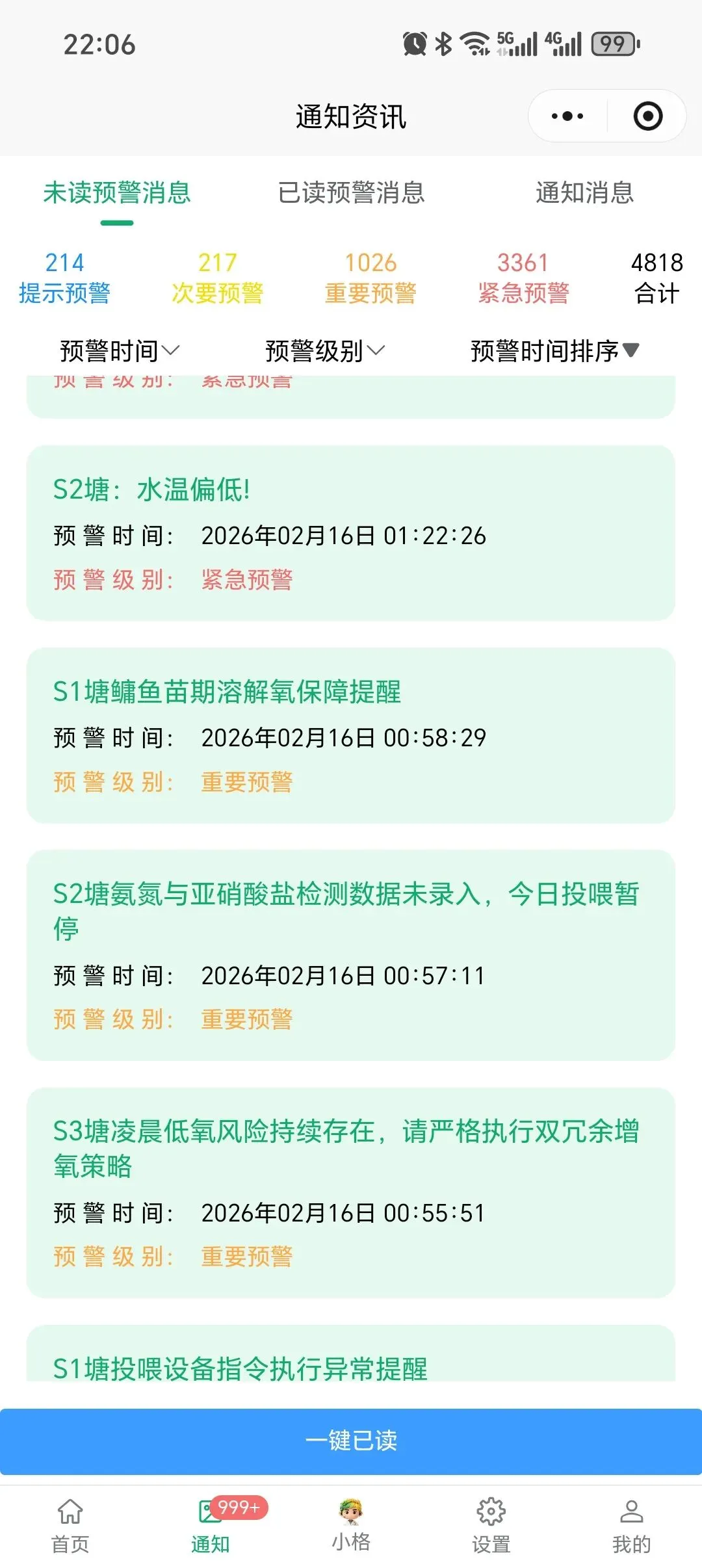 - 实时预警:系统可精准识别S2塘水温偏低、S1塘鱼苗期溶解氧保障不足等紧急/重要风险,及时推送预警信息,指导一线人员快速处置。