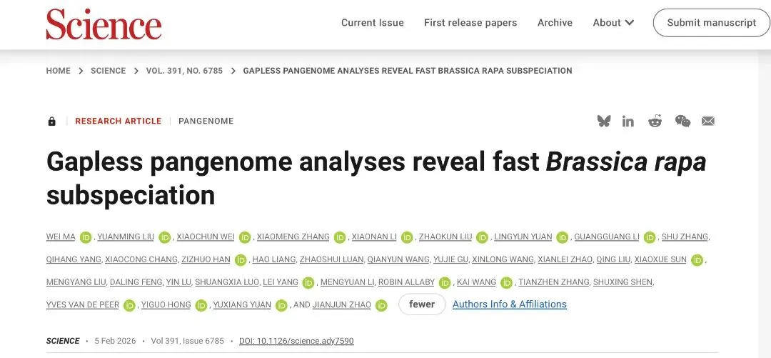 2月6日,《Science》刊发安徽农业大学园艺学院十字花科蔬菜团队与河北农业大学赵建军教授团队及国内外多家科研机构共同完成题为“Gapless pangenome analyses reveal fast Brassica rapa subspeciation”的研究成果。该研究为达尔文提出的“被子植物为何能在地球上迅速崛起、并在极短地质时间内完成爆发式多样化”这一悬而未决的“恼人之谜”提供了新的基因组学视角:以一棵看似普通的白菜(Brassica rapa)为切入口,系统描绘了“白菜王国”如何从一个共同祖先演变为“诸侯并立”的多亚种格局,构建了一个将经典进化问题落地到具体作物系统的基因组学研究范例。