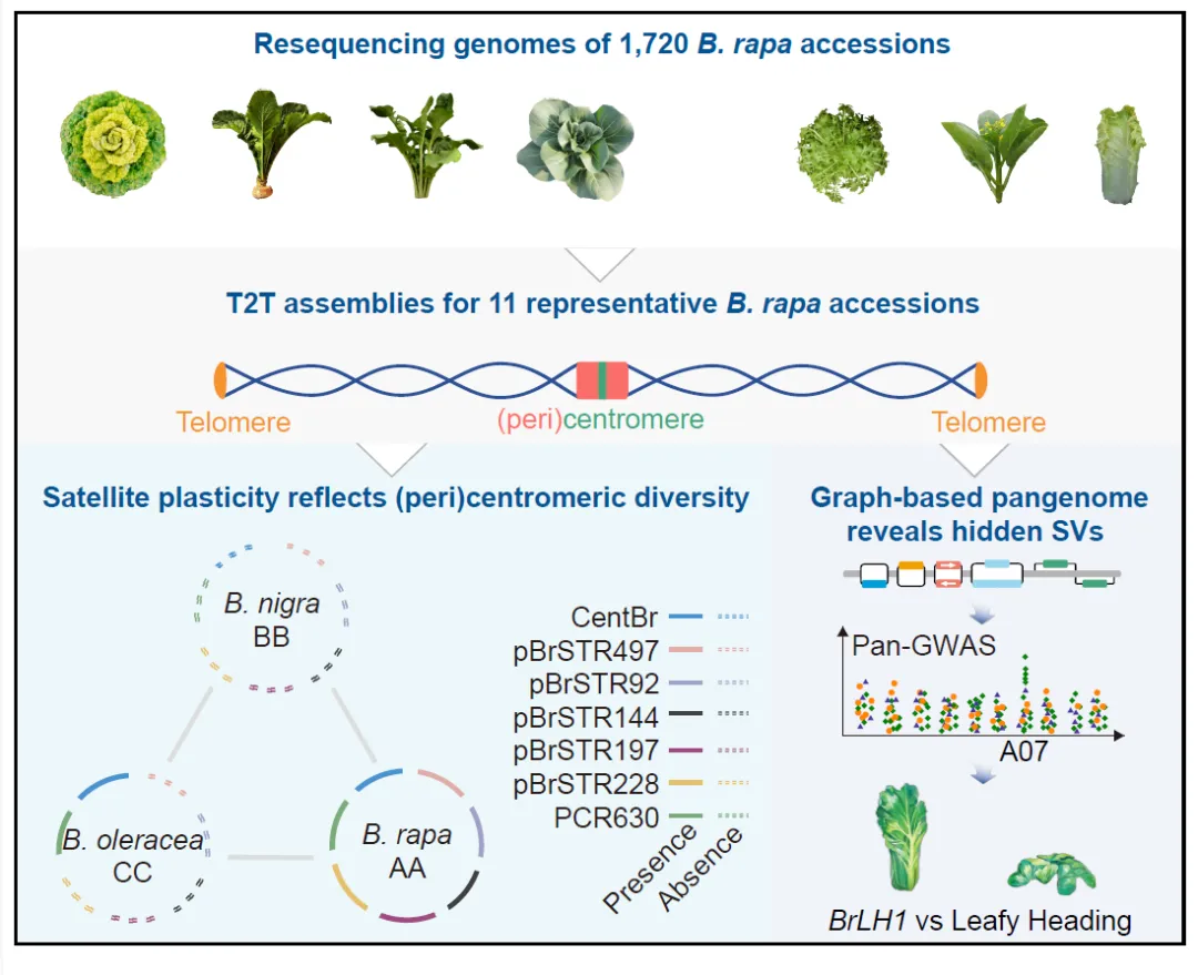 该研究对1720份不同亚种的白菜材料,其中包含安徽农业大学园艺学院十字花科蔬菜团队301份乌菜种质资源,进行“人口普查”式的基因组重测序,精选7个亚种的11份“诸侯”代表材料,从基因组、泛基因组和泛遗传学三个层面系统刻画了白菜亚种快速分化的遗传基础,把被子植物“快速扩张”的经典问题研究具体落实到一个肉眼可见的演化框架之中;通过构建完整着丝粒图谱,揭示了卫星重复、着丝粒动态与结构变异在芸薹属物种演化中的关键作用,加深了对芸薹属基因组起源与分化顺序的认识。审稿人认为,该工作是Brassica基因组研究领域“一次里程碑式的飞跃”,构建的0 gap基因组与泛基因组资源“树立了群体基因组学研究的新标杆”,有望成为“芸薹属遗传学的里程碑工作”。同时审稿人也指出,这一研究“代表了巨大的工作量,将成为整个领域的重要资源,对植物基因组演化和作物表型多样性的理解具有广泛而深远的影响。河北农业大学马卫教授、刘远铭副教授、张晓孟副教授,河南省农科院蔬菜研究所魏小春研究员,沈阳农业大学李晓楠教授,苏州农业科学院蔬菜研究所刘照坤研究员,安徽农业大学袁凌云教授,广州市农业农村科学院李光光高级农艺师为该论文的共同第一作者。河北农业大学赵建军教授、马卫教授和洪益国教授,河南省农科院蔬菜研究所原玉香研究员,比利时根特大学Yves Van de Peer教授为论文的通讯作者。该研究得到了国家自然科学基金、安徽省“双一流”培育学科等资金项目的支持。