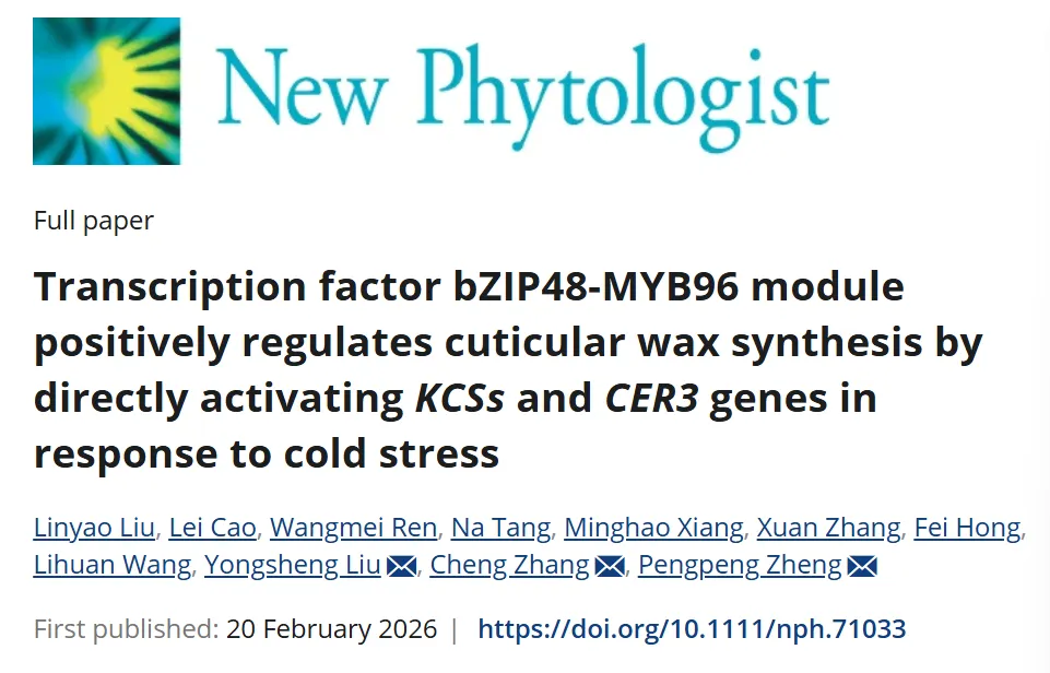 2026年2月20日,国际植物经典期刊《New Phytologist》在线发表安徽农业大学园艺学院刘永胜/郑朋朋团队题为“Transcription factor bZIP48-MYB96 module positively regulates cuticular wax synthesis by directly activating KCSs and CER3 genes in response to cold stress”的研究论文。该研究成果揭示了转录因子bZIP48-MYB96模块通过直接激活KCSs和CER3促进冷胁迫下植物的蜡质合成,从而正调控植物冷冻胁迫耐受。