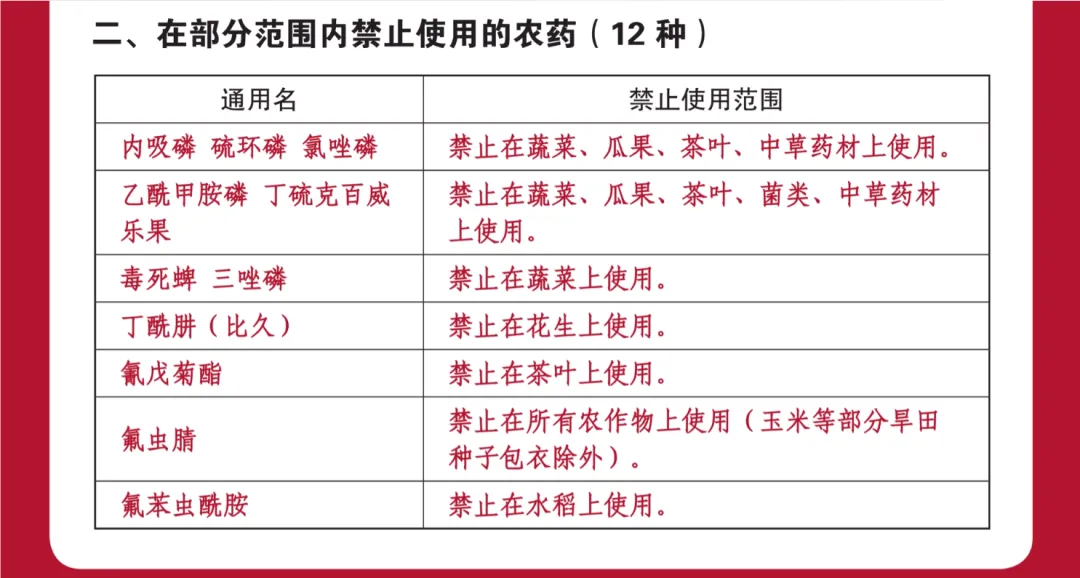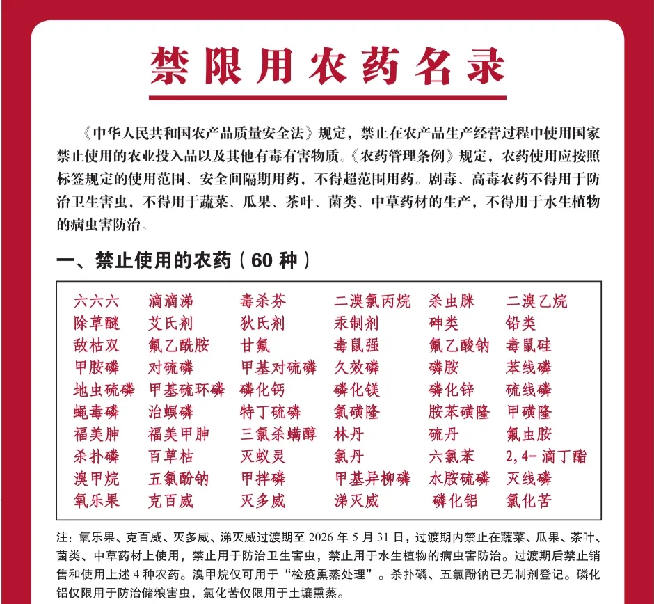 截至目前,禁用农药达60种,例如:六六六、滴滴涕等;限用农药12种,例如:毒死蜱、三唑磷等。