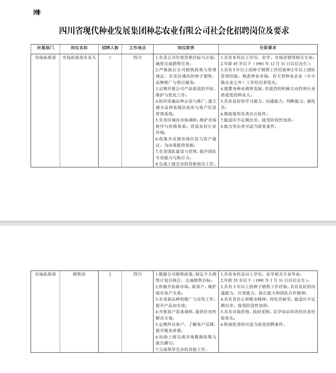 四川省现代种业发展集团种芯农业有限公司(以下简称种芯农业公司)是四川现代种业集团布局农作物种业发展的重要平台,于2024年1月16日挂牌运行,国有企业,注册资本4000万元。公司主营业务为水稻(含低镉水稻品种)、大豆、玉米、油菜等农作物种子培育、生产、经营及进出口,农业社会化服务,农业园区管理服务等。目前已获得农作物种子生产经营许可证B、C、D证;同时,承担地方政府种业项目及其他重大农业项目,参与地方乡村振兴建设,为乡村振兴作出应有的贡献。为满足公司发展需要,现面向社会公开招聘工作人员,公告如下:一、招聘原则坚持“公开、平等、竞争、择优”的原则,采取报名、资格审查、笔试、面试、背调、体检、公示等方式进行招聘。二、招聘条件(一)基本条件1.政治立场坚定,拥护党的路线方针政策,严格遵守党的政治纪律和政治规矩,具有良好的职业操守。2.具有较强的干事创业精神、敬业精神和团队协作精神,认同公司的事业和文化。3.遵纪守法、诚实守信、勤勉尽职、品行端正。4.具有正常履行职责的身体条件和心理素质,能承受履行岗位职责所需要的劳动强度和工作压力。5.具有符合职位要求的工作能力。6.符合法律法规规定和岗位要求的其他资格条件。(二)限制条件凡有下列情形之一的,不得报考:1.曾受过各类刑事处罚和曾被开除公职的;2.有违法、违纪行为正在接受审查的;3.尚在党纪、政务处分影响期内的;4.被依法列为失信联合惩戒对象的人员;5.在各类招考中被认定有舞弊等严重违反录用纪律行为的人员;6.背景调查结果显示存在重大风险项的;7.法律、法规规定的其他情形;8.录用后构成回避关系的;9.公司认定的不得招聘的其他情形。三、岗位职责及任职要求本次招聘共计2个岗位共3人,拟招聘岗位职责及任职要求(详见附件1)