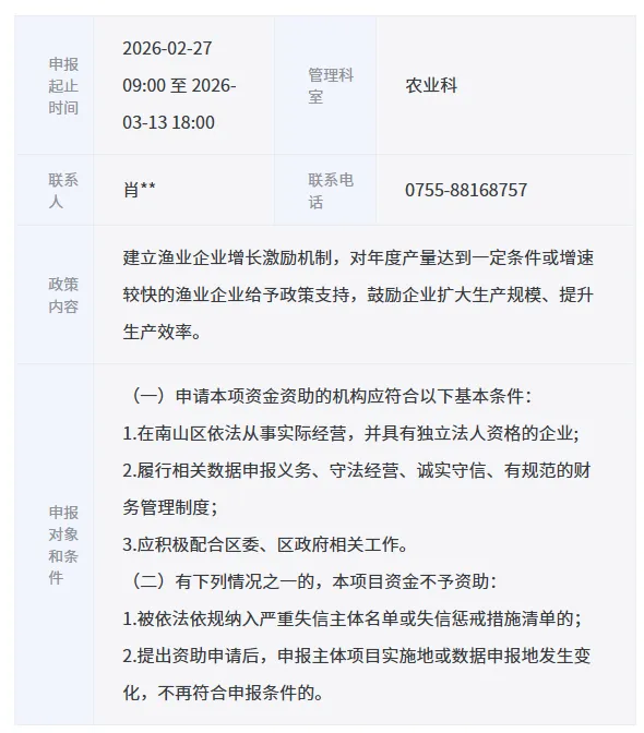 南山区申报2025年鼓励渔业企业做大做强资助项目