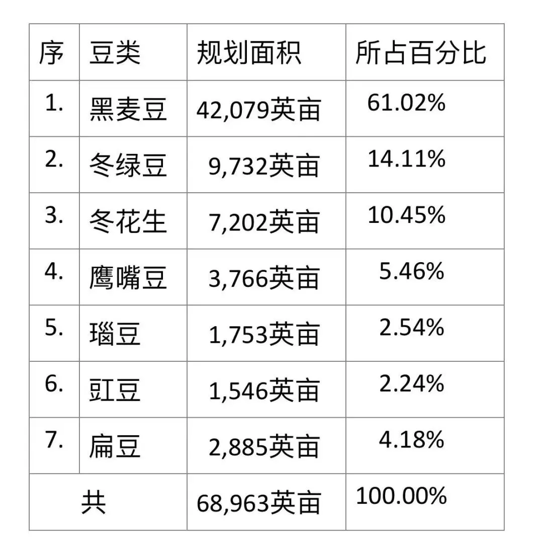 今年冬季榜地县区规划种植的各种豆类面积如下表: