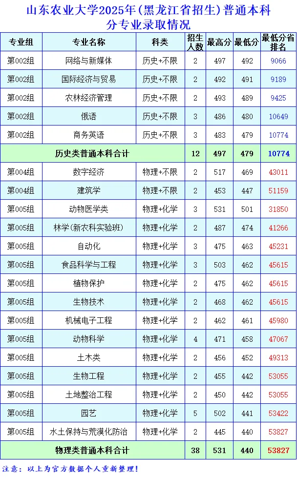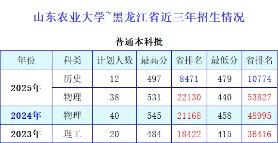 2025年在黑龙江省累计计划招生50人,其中普通物理类两个志愿组计划招生38人,录取最高分是531分,省排名是22130,录取专业是动物医学类。历史类一个志愿组计划招生12人,录取最高分是497分,省排名是8471,录取专业是网络与新媒体。若想在普通本科考入山东农业大学,物理类省排名需要平均在33000名左右。历史类省排名需要平均在9500名左右。