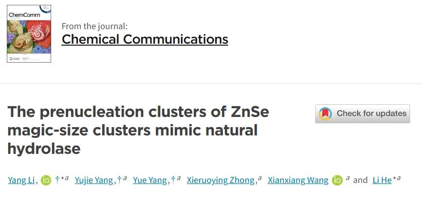 近日,四川农业大学理学院何丽副教授、青年教师李扬在自然指数期刊《Chemical Communications》上发表了题为“模拟天然水解酶的ZnSe幻数团簇”(The prenucleation clusters of ZnSe magic size clusters mimicking natural hydrolase)的研究论文。该研究受天然碳酸酐酶结构启发,首次报道了硒化锌预成核簇作为一种新型水解纳米酶的应用。