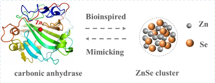 在仿生催化领域,纳米酶因其高稳定性、低成本和易于改性等优点,被视为天然酶的理想替代品。然而,目前约93%的纳米酶研究集中在模拟氧化还原酶(如过氧化物酶和氧化酶),而对水解纳米酶的开发相对匮乏。天然碳酸酐酶是一种典型的水解酶,其活性中心由三个组氨酸残基配位的锌离子组成。课题组通过模拟其结构,探索了具有精确原子组成且表面暴露大量锌位点的ZnSe魔术尺寸簇及其预成核簇的催化潜力。