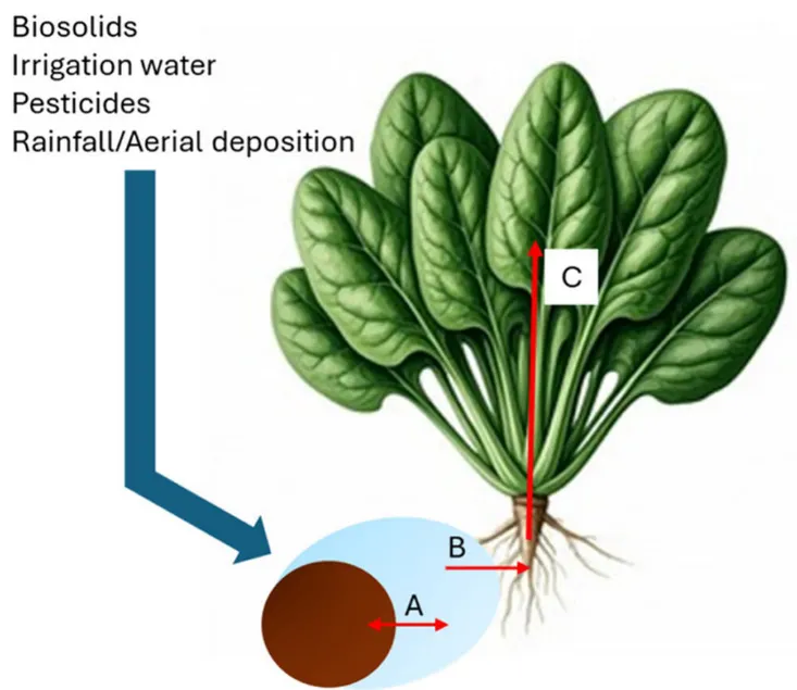 TFA是一种C2全氟化合物,具有羧基头部基团(CF3COOH),是全氟烷基羧酸中碳链最短的物质。最重要的是,TFA是许多PFAS转化途径的终末产物,这可能解释了其在环境中浓度随时间显著上升的现象。农业系统中TFA(或其前体)的主要来源包括生物固体、灌溉水、农药以及降雨/大气沉降(图1)。一旦进入土壤,TFA的超短链和亲水性表明其很可能倾向于分配到土壤溶液中。事实上,在近期的一项研究中,(2)开发了一种机器学习方法,用于生成TFA(及其他PFAS)的土壤固液分配系数(Kd)空间分布图。针对欧洲的预测图显示,该区域大部分地区的TFA log Kd值较低(<0 L kg–1)。在受TFA污染的土壤中,较低的固相吸附水平增加了植物通过根系吸收含TFA土壤溶液而摄入TFA的可能性。