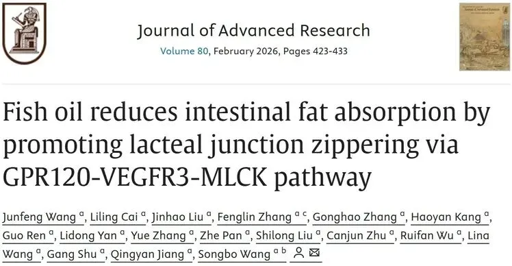 近日,华南农业大学动物科学学院江青艳教授和王松波教授团队,以猪禽种业全国重点实验室/岭南现代农业科学与技术广东省实验室/广东省动物营养调控重点实验室为第一单位,在国际主流学术期刊Journal of Advanced Research(中科院一区top期刊,影响因子13.0)发表了题为“Fish oil reduces intestinal fat absorption by promoting lacteal junction zippering via GPR120-VEGFR3-MLCK pathway”的研究论文,研究首次揭示鱼油通过GPR120-VEGFR3-MLCK通路促进肠道的乳糜管连接"拉链化",从而减少肠道脂肪吸收。