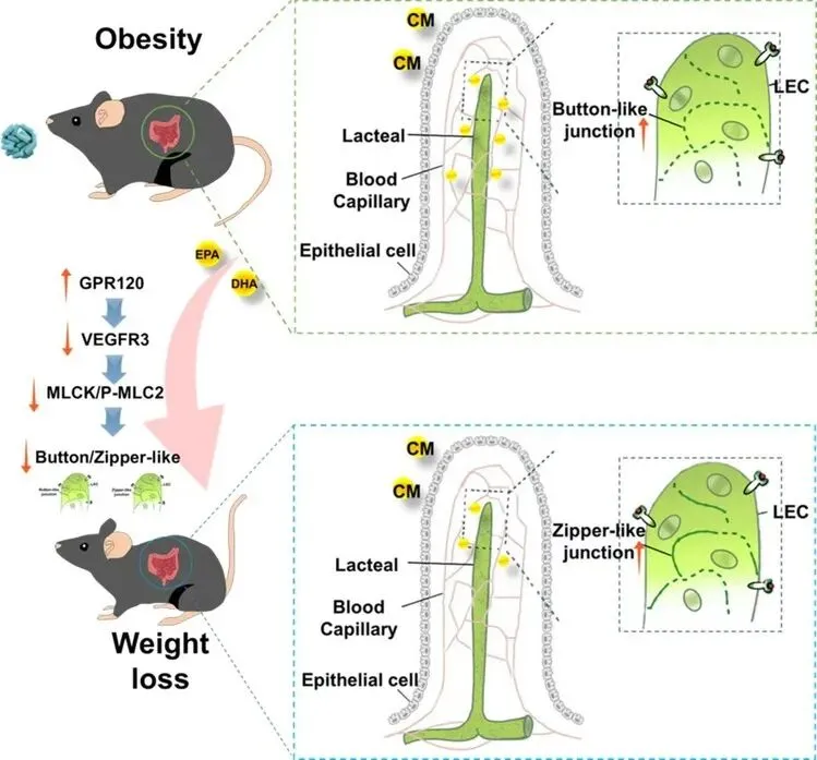 肠道是营养物质吸收最重要的器官,调控肠道对脂肪的吸收效率对于动物生长发育及机体健康具有重要意义。脂肪在肠道吸收过程包括肠上皮细胞对脂肪酸的摄取、甘油三酯的重新合成、乳糜微粒(CM)的合成、乳糜微粒进入乳糜管,其中乳糜微粒进入乳糜管是肠道脂肪吸收的最终关键步骤。乳糜微粒进入乳糜管依赖于乳糜管中淋巴管内皮细胞之间的连接方式,该连接方式分为Botton-like junction(纽扣状连接,促进吸收)和Zipper-like junction(拉链状连接,抑制吸收)。本研究首次发现,鱼油通过GPR120-VEGFR3-MLCK通路促进乳糜管拉链化,从而减少脂肪吸收。研究结果为肠道脂肪吸收调控提供了新的靶点和策略。
