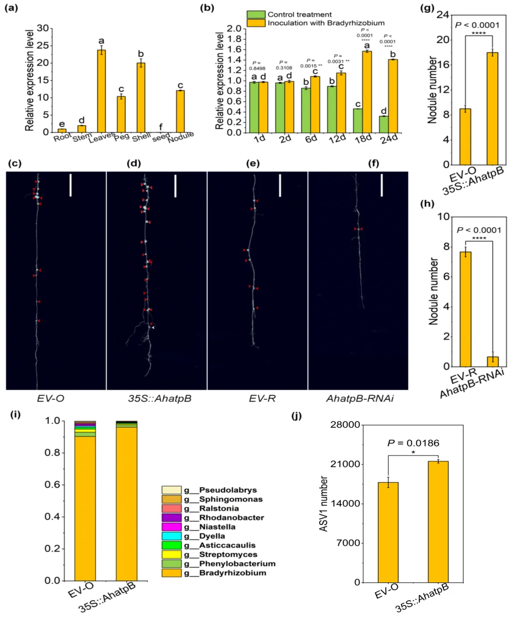 图1 基因AhatpB正调控花生根瘤数和慢生根瘤菌丰度