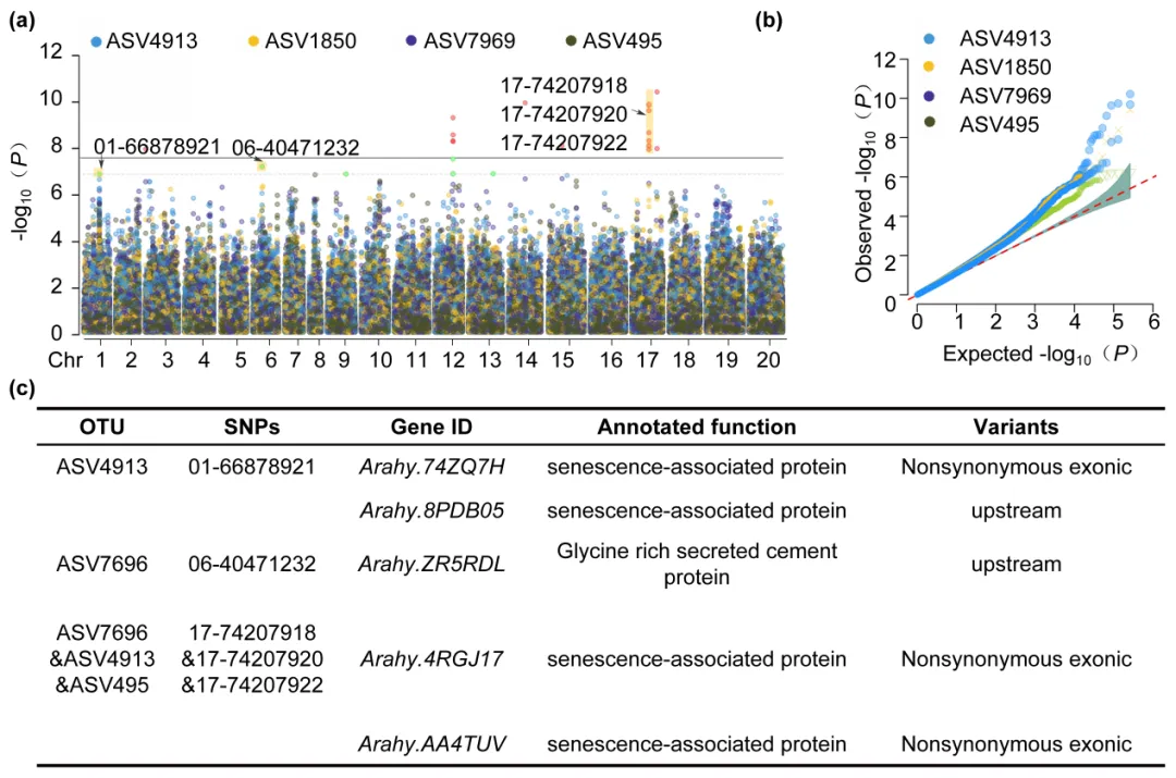 此外,本研究还通过花生根瘤内的核心菌群鉴定了4个与花生的单株结瘤数呈显著正相关的OTU(ASV4913、ASV7696、ASV1850和ASV495),通过对这4个OTU的丰度进行全基因组关联分析,共检测到15个显著的SNP位点(图2),并对位点内基因进行单倍型分析。研究结果为利用植物微生物助力育种提供研究框架和重要基因资源。