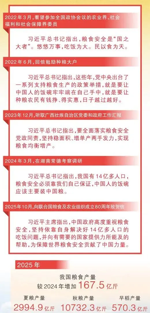 回望“十四五”,我国粮食年产量由2021年的13657亿斤增至2025年的14297.5亿斤,全球每5斤谷物就有1斤多产自中国;我国人均粮食占有量由2021年的483公斤增至目前的500多公斤。