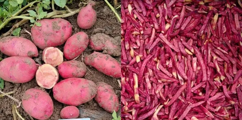 ——红色薯种,功能与风味兼具。作为此次中试项目的核心原料品种,“陇薯红1号”由省农科院马铃薯研究所面向寒旱地区实际需求定向选育而成。该品种抗旱性强,特别适宜在半干旱等典型旱作农业区域推广种植。其薯皮鲜红光滑、薯肉呈红黄渐变,富含锌元素和花青素,具有较高的营养价值和市场辨识度。加工过程中采用真空低温油炸工艺,有效保留了原料中的营养成分与天然风味,加工出的薯条酥脆适口、薯香浓郁,可同时满足鲜食和薯片、薯条等休闲食品加工需求,契合当前市场对健康食品的消费趋势。