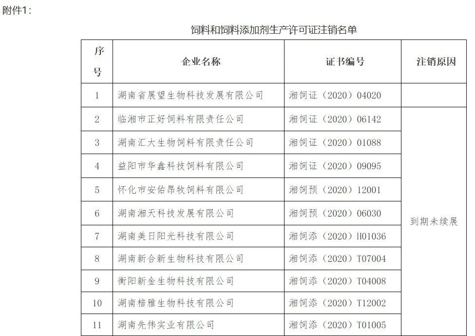 湖南省展望生物科技发展有限公司等11家企业饲料和饲料添加剂生产许可证有效期届满且未按规定续展,根据《饲料和饲料添加剂管理条例》(中华人民共和国国务院令2011年第609号)、《饲料和饲料添加剂生产许可管理办法》(中华人民共和国农业农村部令2017年第8号修订)及《饲料添加剂产品批准文号管理办法》(中华人民共和国农业农村部令2011年第5号)的有关规定,符合法定注销情形,现予注销生产许可证。湖南新合新生物科技有限公司等4家企业饲料添加剂产品批准文号同步注销。