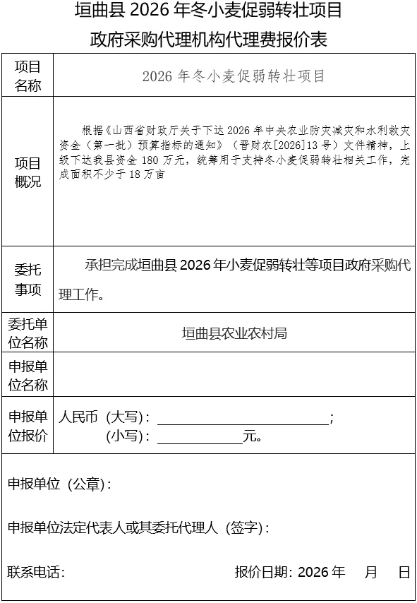 为确保垣曲县2026冬小麦促弱转壮项目工作顺利实施,遴选政府采购代理机构,现将有关事项公告如下: