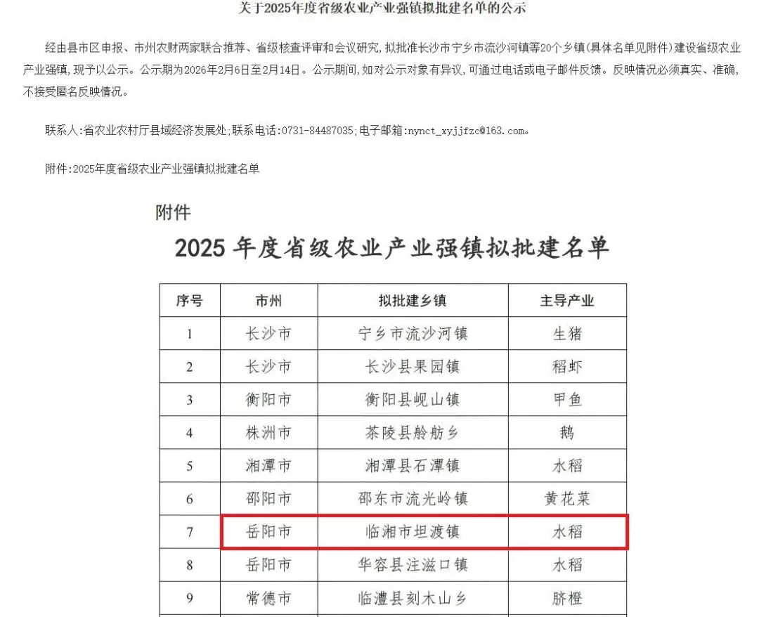 近日,湖南省农业农村厅发布2025年度省级农业产业强镇拟批建名单公示,我市坦渡镇凭借特色水稻产业成功入选。