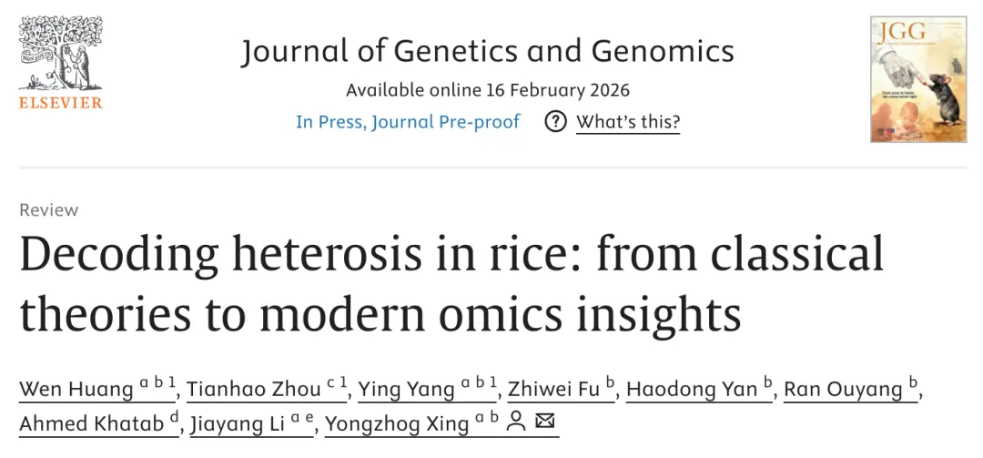 2026年2月16日,Journal of Genetics and Genomics在线发表崖州湾国家实验室和华中农业大学邢永忠教授团队题为“Decoding heterosis in rice: from classical theories to modern omics insights”的综述论文。该综述系统性总结了杂种优势的基础研究,从基因组学、表观基因组学、转录组学和代谢组学视角,深入探讨了不同尺度下的杂种优势机制,并提出基于人工智能辅助育种的理论框架。