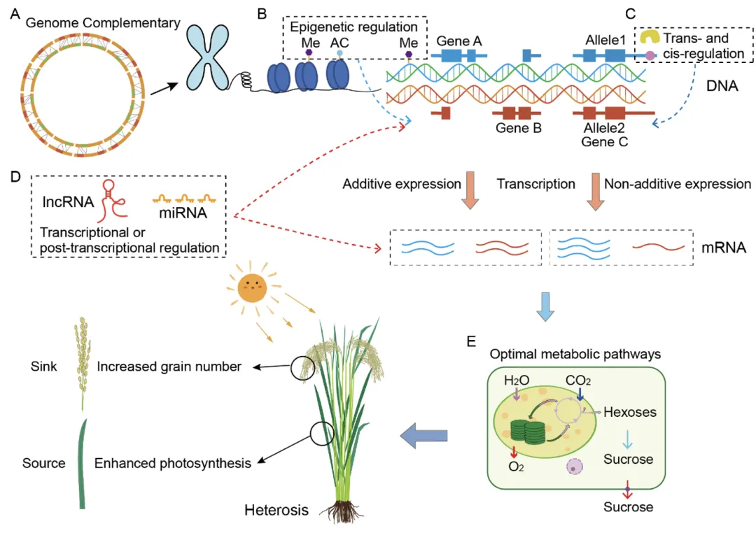 杂种优势是F1代杂交种在生物量、产量以及抗逆性等方面优于其亲本的生物学现象。杂交水稻的应用极大地提升了水稻产量,为保障全球粮食安全做出了不可磨灭的贡献。然而,目前尚缺乏统一的分子理论来解释杂种优势。