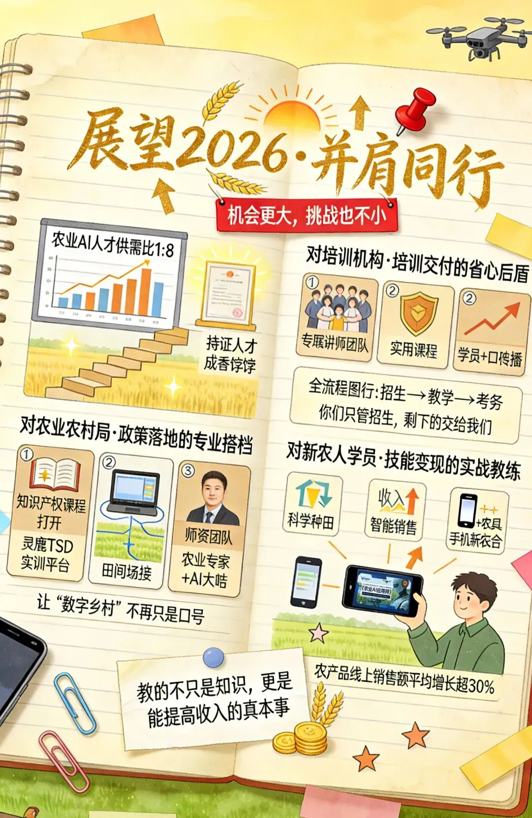 我们的课程有知识产权,质量稳定,能帮大家把数字乡村、高素质农民培育这些政策落到实处。我们自己的AI实训平台“灵鹿TSD”,也能把培训跟实际生产场景连起来,让学员学了就能用。师资团队也都很能打,既有农业专家,又有AI大咖,培训效果看得见、摸得着。