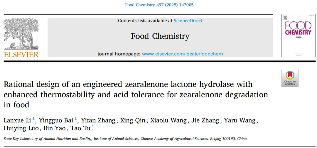 2025 年 11 月 9 日,来自中国农业科学院的Lanxue Li和Yingguo Bai等人在Food Chemistry上发表了一篇题为Rational design of an engineered zearalenone lactone hydrolase with enhanced thermostability and acid tolerance for zearalenone degradation in food的研究性论文。