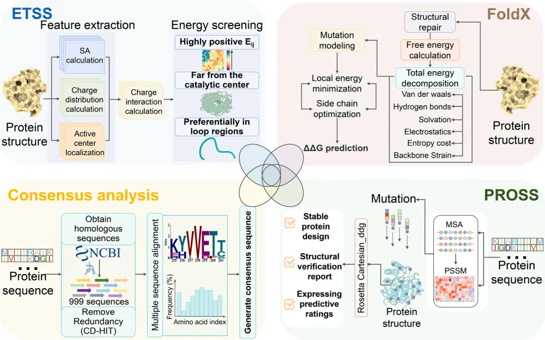 建立了一个四维正交设计框架,用于对I160Y母体进行稳定性改造(图1),旨在平衡进化适应性、热力学稳定性和结构兼容性(图1)。该整合策略包括:(1)通过ETSS进行静电优化,识别出34个热不稳定残基;(2)对999个同源序列进行进化保守性分析,筛选出37个保守位点;(3)利用FoldX进行全局稳定性扫描,预测出176个稳定化突变(ΔΔG < 0 kcal/mol);(4)通过PROSS进行进化可塑性图谱分析,锁定50个功能兼容的替代位点。