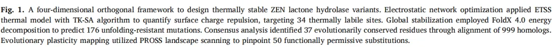 酶法脱除玉米赤霉烯酮(ZEN)的工业化应用潜力长期受限于天然内酯水解酶在食品加工条件下的固有不稳定性。通过酶工程改造突破这些限制条件构成了关键性进展,对于保障乳制品和谷物制品安全尤为重要。本研究建立了一个多维计算框架,通过协同整合四种正交设计策略,实现了对传统单参数优化的根本性突破,有效规避了稳定性与活性之间的典型权衡效应。该框架融合了基础热力学认知与机器学习辅助预测:例如,FoldX能量计算量化了R76Q取代的稳定化贡献(ΔΔG = −0.779 kcal/mol),该预测与实验数据高度吻合;ETSS分析则诊断出R76残基存在临界静电不稳定性,表现为强正电势(Eij = +6.25 kJ/mol)和异常pKa值(−68.92 kT/e),提示电荷过饱和状态。PROSS与保守性分析进一步验证了R76Q作为进化兼容突变的最优性,可实现表面电荷的优化再分布。通过融合机器学习辅助预测和战略性二硫键工程,该框架实现了酶分子骨架的整体稳定性强化,其提升幅度超越了既往研究。