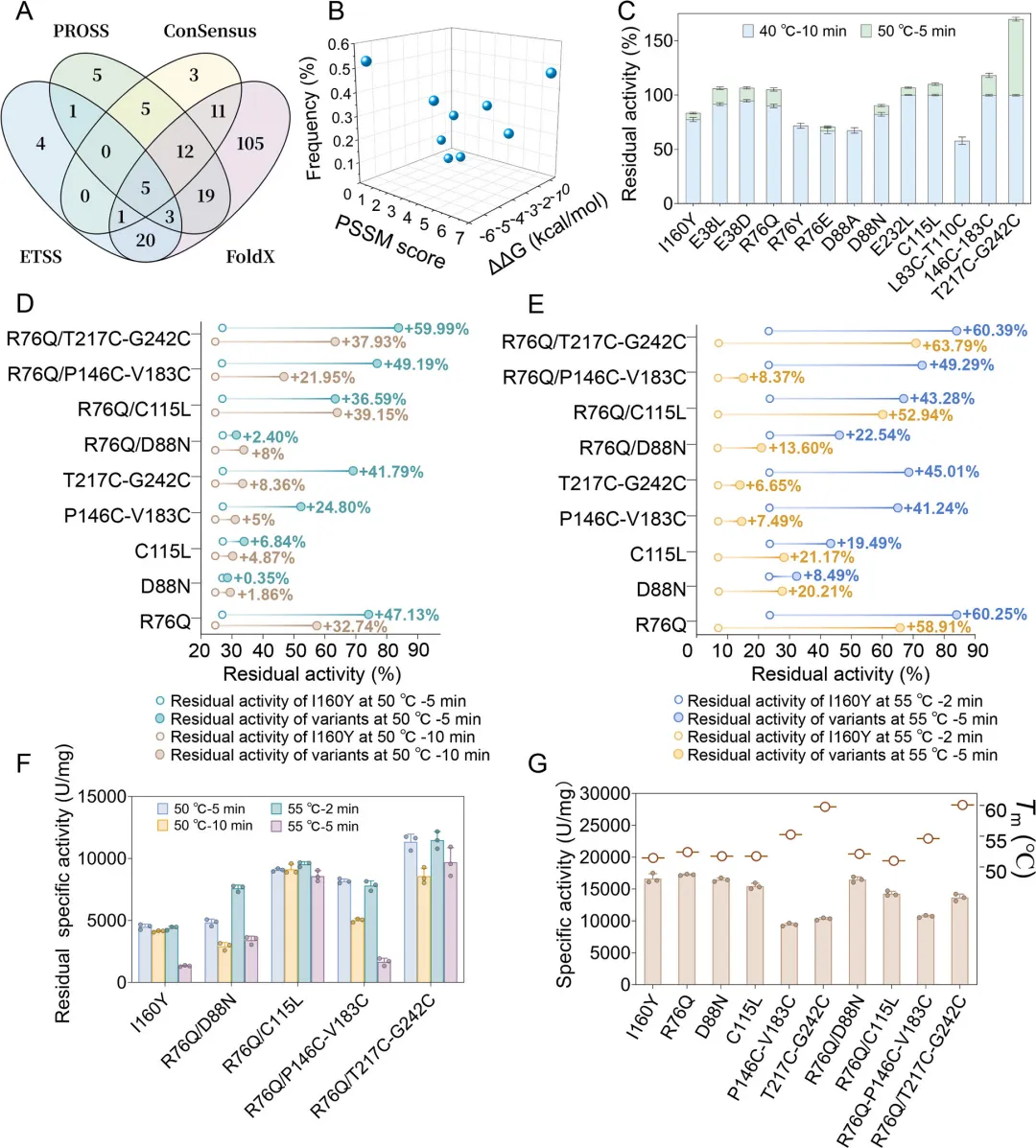 通过50℃和55℃条件下的延长时间热处理实验,筛选出五个优势突变体:R76Q、D88N、C115L、P146C-V183C和T217C-G242C(图2D、E)。其中,R76Q突变体表现出最高的热稳定性,在55℃处理2分钟和5分钟后分别保持84%和66%的残余活性,较I160Y分别提升2.5倍和8.4倍。含二硫键的突变体P146C-V183C和T217C-G242C在50℃处理5分钟后残余活性分别为65%和69%,较I160Y分别提高92%和155%。虽然R76Q、D88N和C115L保持了较高的比活力,但含二硫键的突变体比活力出现适度下降(约为I160Y的62.5%),却获得了构象稳定性提升,其熔解温度(ΔTm)分别增加3.78℃和8.28℃(图2G)。这表明二硫键工程在保留关键催化功能的同时,优先实现了结构完整性的强化。