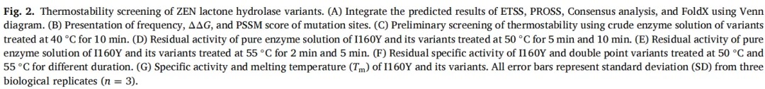 在食品安全领域,谷物中的真菌毒素污染,特别是玉米赤霉烯酮(ZEN)污染,对公众健康和食品质量构成重大威胁。前期研究从美洲大蠊中鉴定出一种新型ZEN内酯水解酶ZHD607(GenBank登录号:KIW70607),该酶具有优良的脱毒活性。通过理性设计,后续引入酪氨酸残基构建了I160Y突变体,以增强与ZEN大环内酯环的疏水作用和π-π堆积相互作用。该突变体比活力达16,652 U/mg,可在30分钟内完全降解16.6 mg/L的ZEN,催化效率较ZHD607提升3.4倍。然而,其适中的热稳定性限制了工业应用——在40℃下半衰期仅70.7分钟。为攻克这一瓶颈,启动了系统性工程改造研究,旨在开发适用于工业化食品加工的稳健酶变体。