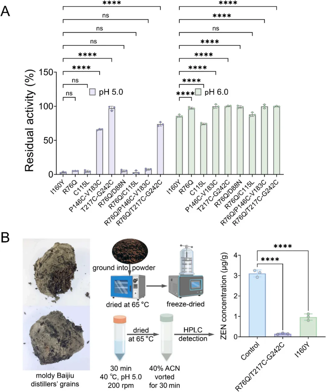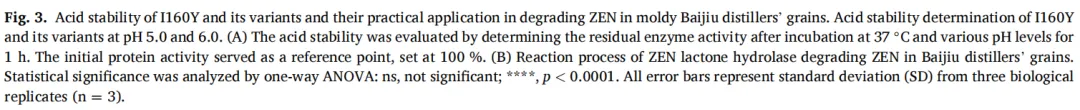 在与食品加工相关的模拟酸性条件(pH 5.0)下,R76Q/T217C-G242C突变体处理30分钟后,对酒糟中天然存在的ZEN降解率达95.13%,使其浓度从初始的3.08微克/克降至0.15微克/克(图3B)。相比之下,在相同条件下用母体酶I160Y处理的对照组,其降解率显著较低,仅为69.22%(p < 0.0001),ZEN浓度降至0.95微克/克。这意味着经R76Q/T217C-G242C突变体处理后,ZEN终浓度较I160Y组降低6.3倍(0.15微克/克 vs. 0.95微克/克)。这些结果证明该突变体在复杂真实基质中具有更强的降解能力,凸显了其在提升受污染谷物及其副产物安全性方面的工业应用潜力。