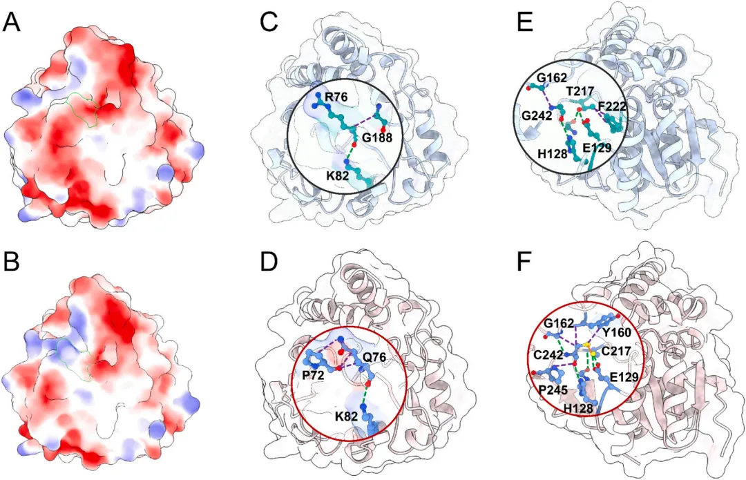 R76Q/T217C-G242C突变体热稳定性的提升源于两个关键突变位点相互作用网络的重构。在76位点,R76Q突变在保留R76 O与K82 NZ之间关键极性接触(2.875 Å,与I160Y中观察到的结构类似)的同时,将原有的R76 CA与G188 CA之间的疏水相互作用(4.115 Å)优化为Q76 NE2与P72 CB之间更有利的疏水接触(3.862 Å)(图4C、D)。此外,V78 CG2与Q76主链N原子之间新形成的疏水相互作用(3.768 Å)进一步稳定了侧链构象。Q76主链羰基氧与D77之间的偶极-偶极相互作用(3.234 Å)通过静电作用限制主链柔性,与邻近疏水接触共同促进环区结构的稳定性。除局部相互作用外,R76Q突变还诱导酶分子静电表面发生有利重构。表面电荷分析显示,I160Y中R76位点周围呈现显著的正静电势,形成潜在排斥性微环境(图4A)。R76Q突变有效缓解了这种电荷过饱和状态,形成更中性和互补的静电表面(图4B),从而增强结构完整性与稳定性。