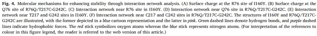 主成分分析和动态交叉相关矩阵进一步揭示了别构偶联机制。构象聚类分析显示,突变体在区域2和区域4呈现集中运动采样,而I160Y则分散分布于三个聚类簇中(图5C-F)。DCCM分析表明,突变体中76号残基与R5-V20区域之间、242号残基与R5-V20及R55-A70区域之间的正动态相关性显著增强,表明跨结构域相互作用网络得到强化。同时,突变体中较弱的负相关性反映出相较于I160Y,其去稳定化运动有所减少。这些多尺度观察结果——从局部相互作用到全局构象动力学——共同表明,突变体热稳定性的提升源于协同效应:易感结构元件的靶向稳定化、结构域协调性改善以及有害运动的抑制。这种分层稳定机制为食品相关酶的理性工程改造提供了设计蓝图。