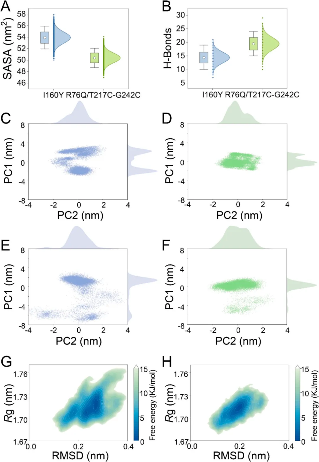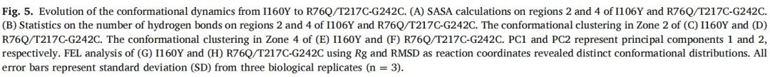为阐明这些结构修饰的动态效应,进行了300 K条件下200 ns的分子动力学模拟,比较了突变体与I160Y的差异。全局构象分析显示,R76Q/T217C-G242C的RMSD波动(0.2 nm)较I160Y(0.275 nm)减小,表明热稳定性增强。自由能形貌分析进一步证实这一发现:突变体占据单一明确的低能态盆地,回转半径(1.69–1.73 nm)和RMSD(0.20–0.27 nm)范围狭窄,而I160Y则采样多个亚稳态(图5G、H)。局部结构稳定化体现在RMSF图谱中:该图谱识别出I160Y中四个高柔性区域,包括区域2(R66-W86)和区域4(T217-G242)——正是突变体的突变位点所在。这些区域溶剂可及表面积降低和氢键网络增强进一步证实了靶向稳定化效应(图5A、B)。