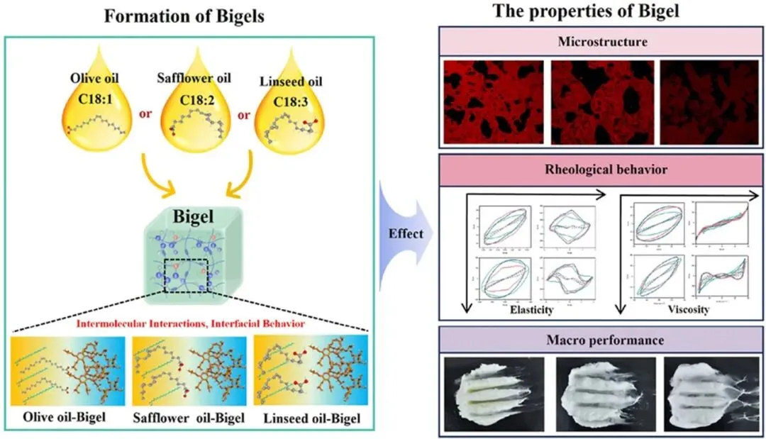 近日,东北农业大学团队在《Food Hydrocolloids》期刊上发表了题为《The unsaturation degree of oils effects the linear/non-linear rheological behavior and stability of bigel》的研究性论文(一区,IF:12.4)。该研究以橄榄油、红花油、亚麻籽油为模型油,制备单甘酯基 oleogel 与羟丙基甲基纤维素水凝胶复合双凝胶(bigel),系统探究了油脂不饱和度对 bigel 微观结构、热稳定性及线性 / 非线性流变行为的影响,揭示了低不饱和度油脂(橄榄油)因脂肪酸链线性结构促进凝胶因子有序堆积,强化界面作用与网络强度,而高不饱和度油脂因链结构弯曲破坏组装稳定性的机制,为健康脂肪替代品的配方优化提供了理论支撑。