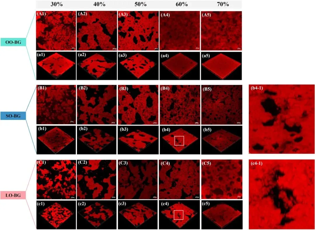 Fig. 1. Schematic diagram of the micro-structure of bigels. (A1∼A5, B1∼B5, C1∼C5) CLSM images; (a1∼a5, b1∼b5, c1∼c5) 3D-CLSM images; A, B, and C represent OO-BGs, SO-BGs, and LO-BGs, respectively; b4-1 and c4-1 are magnified images of the regions within the white boxes in b4 and c4, respectively; the scale bar is 100 μm. 1∼5 indicates a gradual increase in oleogel content.