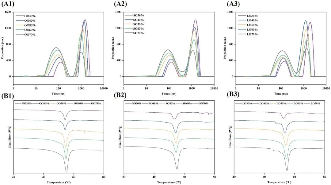Fig. 2. Microstructural stability of bigels. (A1∼A3) Distribution of transverse relaxation times of OO-BGs, SO-BGs, and LO-BGs, respectively; (B1∼B3) DSC thermograms of OO-BGs, SO-BGs, and LO-BGs, respectively.