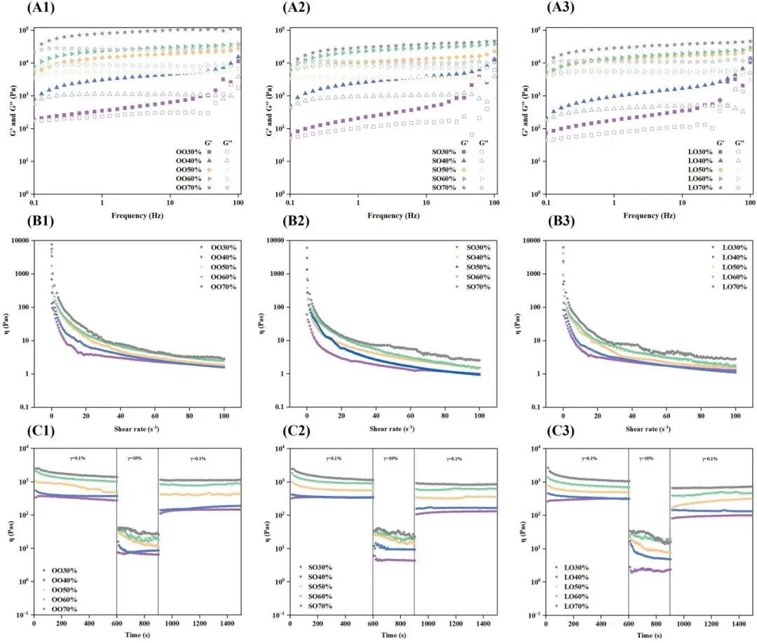 Fig. 3. Rheological properties of bigels. (A1∼A3) Frequency scanning of OO-BGs, SO-BGs, and LO-BGs, respectively; (B1∼B3) Viscosity of OO-BGs, SO-BGs, and LO-BGs, respectively; (C1∼C3) Thixotropic recovery of OO-BGs, SO-BGs, and LO-BGs, respectively.