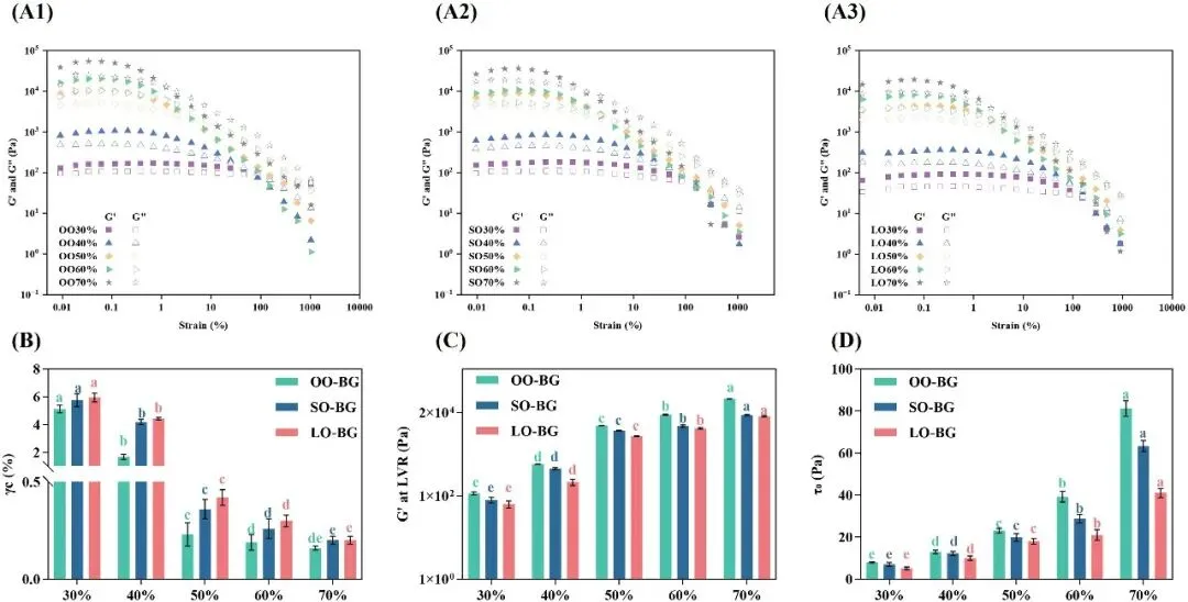 Fig. 4. Strain scanning of bigel in linear and nonlinear regions. (A1∼A3) Strain scanning of OO-BGs, SO-BGs, and LO-BGs, respectively; (B) Critical strain (γc); (C) G′ value at the endpoint of LVR; (D) Yield stress (τ0).